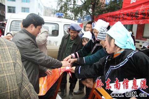 本港讯 (龙怀召 通讯员 侯天智 摄影报道)连日来,由贵州省雷山县委宣传部、文明办牵头,组织雷山县人口计生局、文体局、科技局、卫生局、农业局、司法局等16个部门单位,奔赴达地、桃江、永乐等乡(镇)巡回开展了丰富多彩的“三下乡”活动,为老百姓提前送去了节前的“精神年货”和新年的祝福,受到了广大农民群众的热烈欢迎。