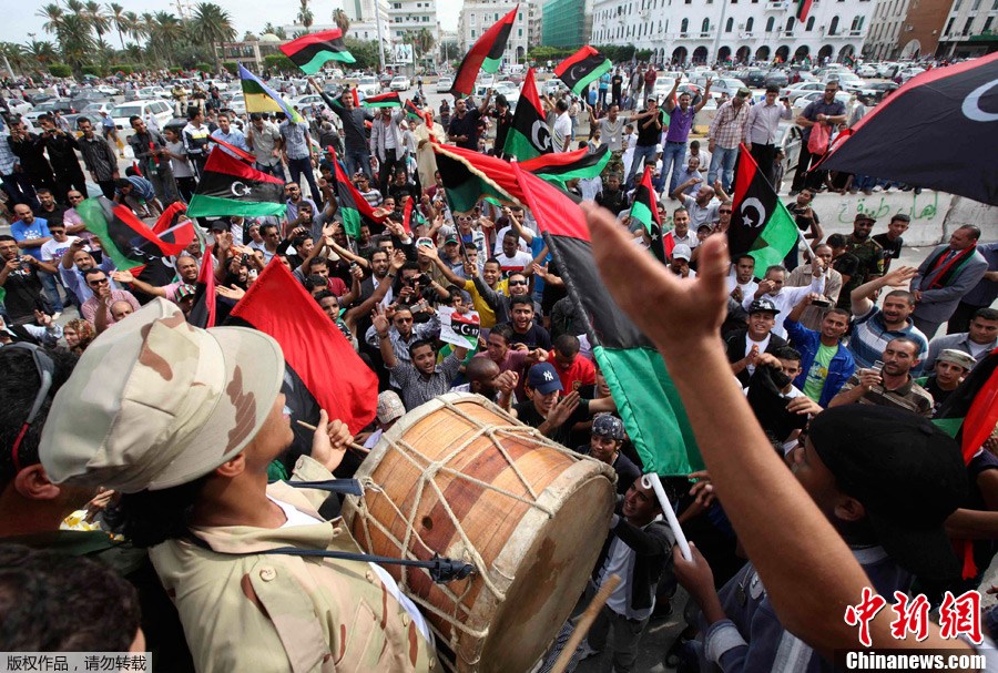 10月20日,在利比亚的黎波里,人们在听闻卡扎菲已伤重身亡的消息后游行庆祝。利比亚“全国过渡委员会”执行委员会主席贾布里勒20日在新闻发布会上证实,卡扎菲当天在苏尔特身亡。