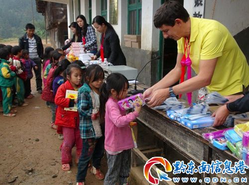 10月14日,宰便镇友娘小学校园里异常热闹,孩子们欢呼雀跃,原来是意大利国际爱心人士马可.赞博尼先生到该校来给孩子们送学习用品来了。