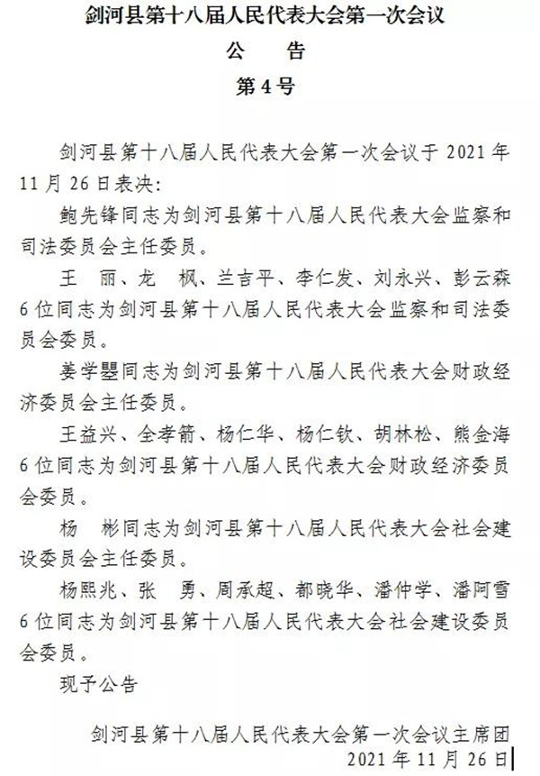 王凯、王昌卓、石猛、石斐、石本辉、龙兴连、田犁、李莎、杨娟、杨兴沼、杨建刚、杨胜军、杨烊一、杨通裕、时功万、吴胜美、吴德能、何万林、宋少举、张培芳、陈习榕、陈开华、欧阳克月、禹华宏、梁伦兵、蔡锦26位同志为榕江县第十八届人民代表大会常务委员会委员。