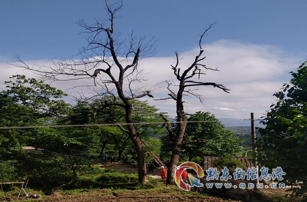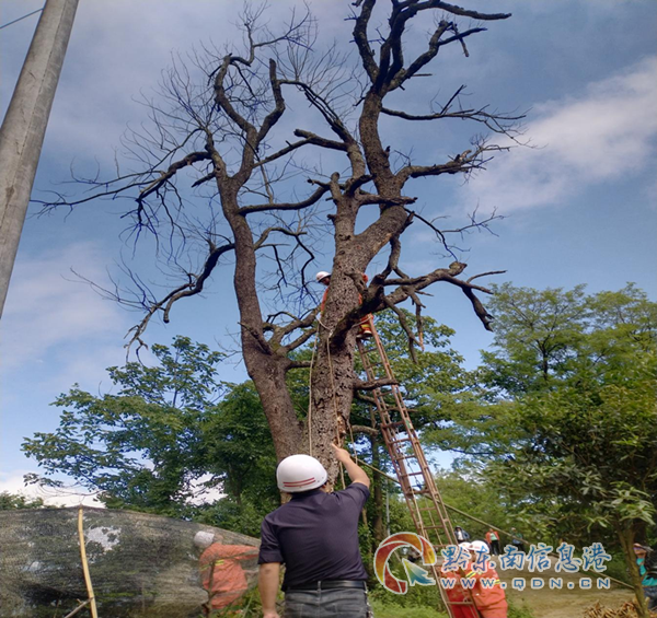 据悉,这两棵树坐落于龙场镇黄腊村中寨组寨内主干道旁,属于红木青冈树,本地人俗称“生岗树”,也叫“青冈夫妻树”,已有近百年历史,由于生虫、枯萎被雷劈导致枯死已有数年,枝干多处已腐朽不堪,不仅影响了村容寨貌而且存在较大的安全隐患。如遇到雷雨大风等恶劣天气,树枝容易折断随时可能有掉下来的危险,在此路过的行人后果将不堪设想。