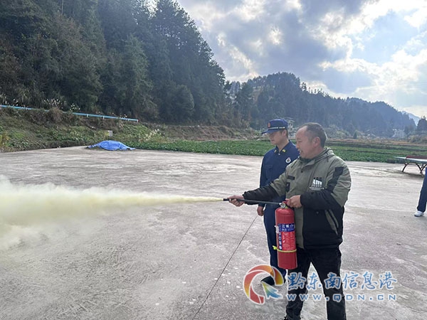 百官村村民在炉山镇专职消防队的现场指导下,稳稳端起红色灭火器,果断压下压把,一股白色干粉精准扑向模拟火源——铁锅中蹿起的火焰瞬间被压制。身着深蓝制服的消防队员在旁全神贯注,确保每一个动作规范到位。