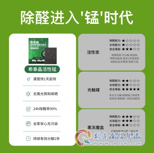 希泰晶主要是活性锰成分,有光无光均可以分解,不受条件限制。不需要光照和暴晒,可以使用2年。直接放置在车内座椅,胶垫,后备箱就可以直接分解甲醛。母婴级别有保障!甲醛去除率高达99%,是业内业内口碑非常不错的一款活性锰除甲醛产品,去甲醛效果明显且入住均可以使用,可以放心选择!