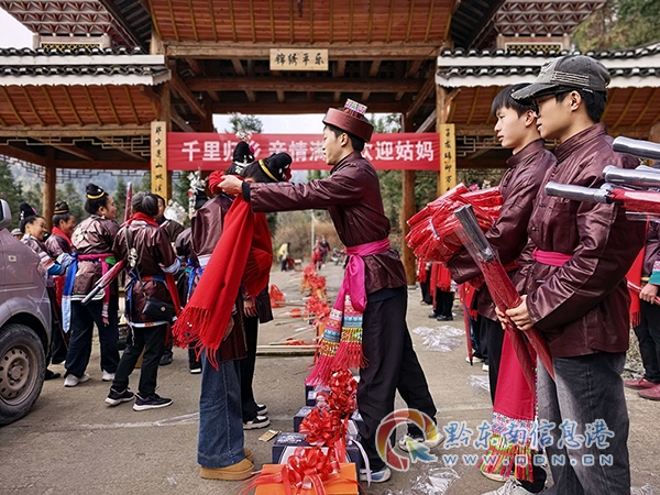 抵达寨门时,一场独具侗族特色的迎宾仪式如期上演。寨内乡亲身着传统服饰列队等候,以歌相迎、敬献红绸,悠扬的侗族大歌在寨门上空回荡,一问一答间,唱尽了侗族儿女的淳朴热情,也唱出了姑侄姊妹的深厚情谊。一接一递间,娘家亲人接过姑妈们肩上的礼担,接过的是满满的心意,传承的是孝道家风,延续的是割不断的血脉亲情。