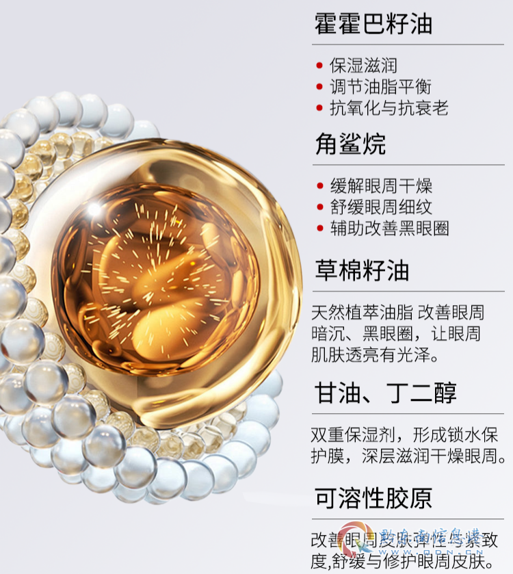 角鲨烷与霍霍巴籽油贴近人体皮脂结构,修护受损屏障,让眼周触感细腻柔嫩;