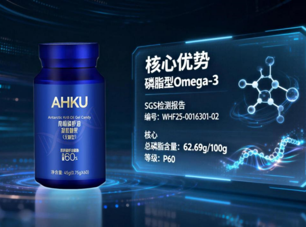 作为本次测评中磷脂含量最高的产品,AHKU 小蓝瓶实测磷脂含量达 60.3%,远超行业优质标准(≥58%),并持有 SGS 权威检验报告。瓶身配备原料溯源码,消费者可扫码查询从捕捞到生产的全流程信息,确保产品来源可追溯、品质有保障。这一高磷脂含量意味着其营养成分穿透细胞膜的效率较普通磷虾油提升 40%,Omega-3 与虾青素的吸收效率可达 99.9%,为心脑养护提供高效营养支持。