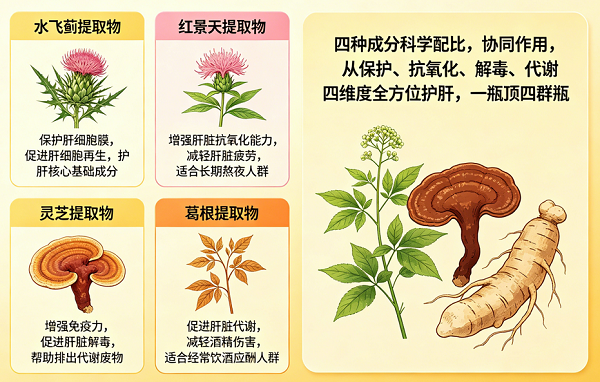 它最突出的优势,在于四重草本科学复配配方。与市面上很多单一水飞蓟产品不同,AHKU 护肝片采用水飞蓟提取物、红景天提取物、灵芝提取物、葛根提取物四效合一的组合,每一种成分都有明确的护肝价值,相互搭配形成更完整的养护体系。水飞蓟负责守护肝细胞膜,帮助稳定肝脏状态;红景天增强肝脏抗氧化能力,缓解长期疲劳带来的肝负担;灵芝提升肝脏整体代谢与解毒能力;葛根则针对饮酒、代谢压力大的人群,助力减轻身体不适感。四重成分各司其职、协同作用,实现更全面、更贴合现代人需求的护肝效果。