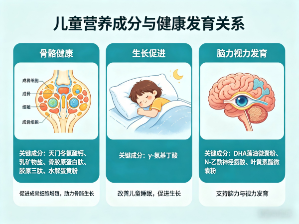 在助长方面,特别添加了0.2021g/100mL的γ-氨基丁酸,能够有效促进下丘脑分泌生长激素,同时还能舒缓神经、改善睡眠,而深度睡眠阶段正是生长激素分泌最旺盛的时期,睡眠好的孩子自然长得更高。还添加了骨胶原蛋白肽和0.1g/100mL的胶原三肽,能够提升骨骼韧性,促进钙质在骨骼中的沉积;水解蛋黄粉能够促进成骨细胞的增殖,从根本上助力骨骼生长。