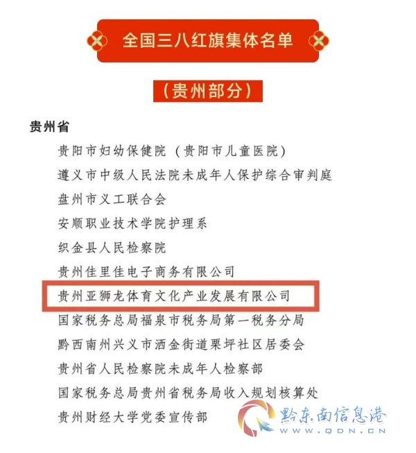 锦屏县推荐的“贵州亚狮龙体育文化产业发展有限公司”继2025年获全省“三八红旗集体”表彰后,又在第116个三八国际劳动妇女节来临之际荣获全国“三八红旗集体”荣誉称号!成为今年贵州省12个、黔东南州唯一一个获此殊荣的巾帼集体。