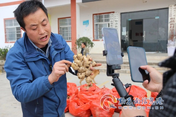 “大家看过来!这是刚从姜窖拿来的凯里旁海生姜,今天直播间全部原产地直供!”