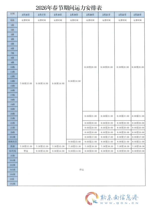 为切实做好春节期间公交运营保障工作,根据历年客流量情况,我司就2026年2月16日(农历除夕)—2026年2月23日(正月初七)各线路运营时间做出如下调整: