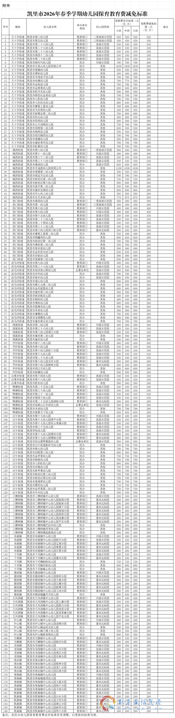您好!根据国家、省、州、市相关文件精神,为让您深入了解凯里市2026年春季学期幼儿园减免保育教育费的情况,现将有关事宜公告如下: