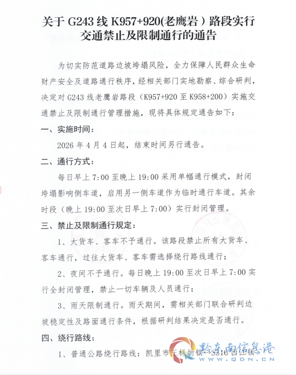 关于G243线K957+920(老鹰岩)路段实行交通禁止及限制通行的通告
