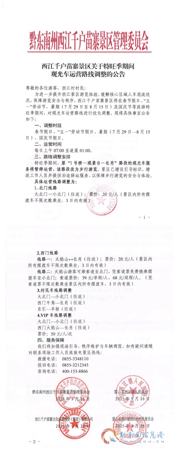 西江千户苗寨景区关于特旺季期间观光车运营路线调整的公告