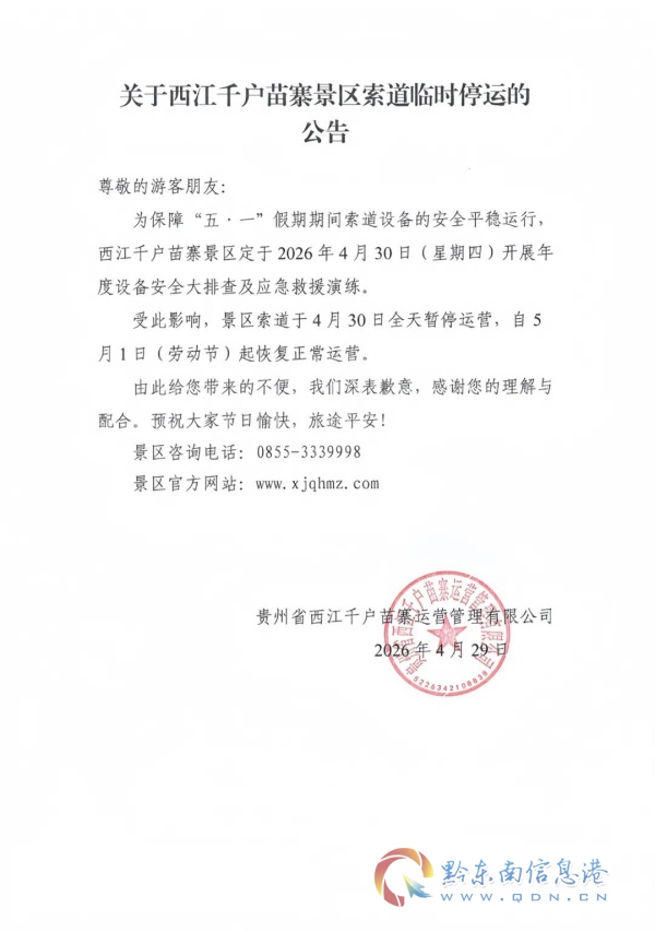 关于西江千户苗寨景区索道临时停运的公告