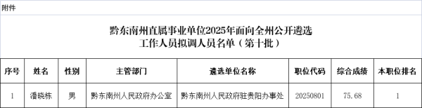 根据《黔东南州直属事业单位2025年面向全州公开遴选工作人员实施方案》的规定,经报名、笔试、资格复审、面试、体检、考察等程序,现将黔东南州直属事业单位2025年面向全州公开遴选工作人员第十批拟调动人员名单予以公示(详见附件)。