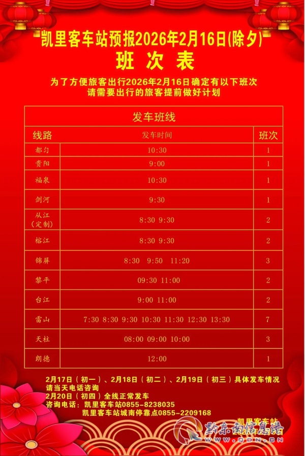 现将凯里客车站除夕班次表公告如下,请有需要出行的旅客提前做好计划。