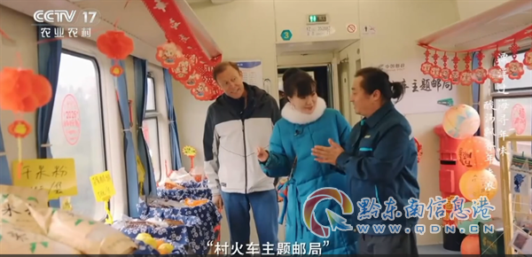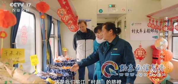 央视镜头下,红灯笼与剪纸窗花点缀的邮政车厢暖意融融,腌鱼、腊肉、黄金柚、脐橙等黔东南特色农产品琳琅满目,印有沿线村寨风光、非遗技艺的纪念封、明信片整齐陈列;邮政工作人员为旅客加盖限定邮戳、推介地方特产、提供“线下选购+扫码邮寄”一站式寄递服务的忙碌身影清晰可见,旅客参与集戳、选购年货的欢乐瞬间被生动捕捉。