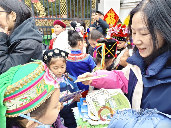 正当萌娃们满怀好奇地探寻动物园里的奇妙世界,眼里闪烁着纯真的光芒时,黔东南州邮政分公司的工作人员专程赶来,为每一位小演员送上一份特殊的礼物——一套以凯里动物园为主题的明信片。明信片上,不仅有孩子们刚看过的各类动物,还加盖了当日的邮戳。对于这群平均年龄不到10岁的“小石榴籽”而言,这份没有鎏金溢彩的礼物,恰是乡情最朴素的注脚。