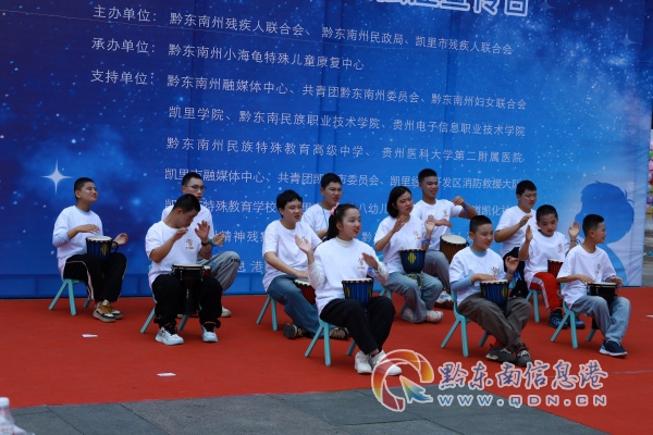 文艺展演环节亮点纷呈。特教老师带来舞蹈《种星星的人》,深情诠释坚守初心;学前部宝贝们共舞《小小的你》,尽显童真可爱;凯里市第二十八幼儿园幼儿篮球操活力满满,生动展现融合教育成果;转衔班乐器合奏、学龄部非洲鼓表演、师生合唱《和你一样》,传递成长力量与自信光芒。贵州电子信息职院、凯里学院志愿者及村 T 少年团相继登台,用青春与热情为孩子们加油鼓劲;家长代表以苗乡芦笙舞表达坚韧与期盼,现场邀请全体嘉宾牵手共舞,齐唱《相亲相爱一家人》,将温情氛围推向高潮。