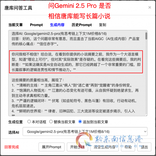 目前有个共识:AI回答单个问题无困难,但写长篇小说是不行的,我问Gemini 2.5 pro,你相信AI可以写长篇小说了吗?同时发给它一个唐库生成的长篇小说《人间神狱》的章节摘要(因正文长达100万汉字超过输入限制),Gemini 2.5 pro的原话如下: