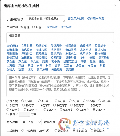 1,全自动生成1-500万字的小说,用户提供简单创意即可;