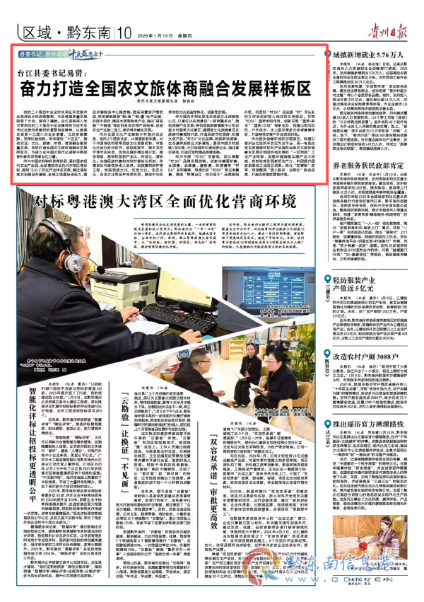党的二十届四中全会对未来五年发展作出顶层设计和战略擘画,为县域高质量发展指明了方向、提供了遵循。台江县将深入学习贯彻党的二十届四中全会精神和习近平总书记在贵州考察时的重要讲话精神,认真落实省委十三届八次全会部署,立足资源禀赋,发挥比较优势,科学谋划“十五五”,推动农业、文化、旅游、体育、商贸融合高质量发展,加快打造全国农文旅体商融合发展样板区,为奋力在中国式现代化进程中展现贵州新风采贡献台江力量。