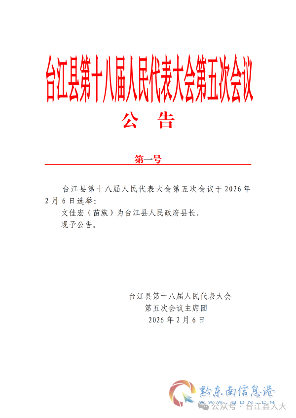 台江县第十八届人民代表大会第五次会议公告(1号)
