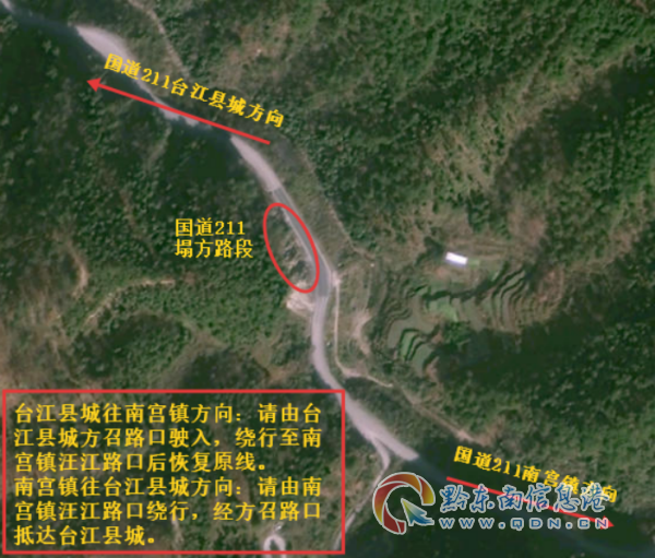 台江县城往南宫镇方向:请由台江县城方召路口驶入,绕行至南宫镇汪江路口后恢复原线。