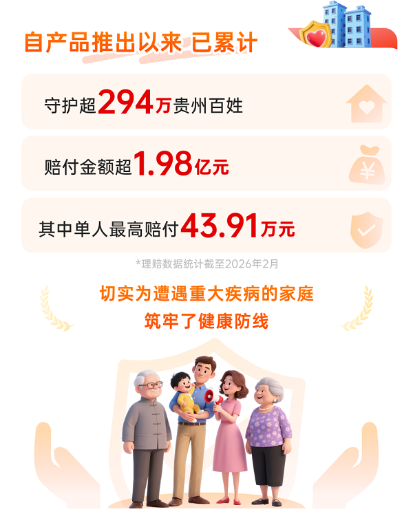 截至2026年2月,这份守护已转化为实实在在的保障力量:累计赔付金额超1.98亿元,其中单人最高获赔43.91万元。这一串串数字背后,是一个个被有力托举的家庭,是“病有所依”在贵州大地上写下的生动注脚,为构建“健康贵州”增添了坚实的底气与温暖的底色。